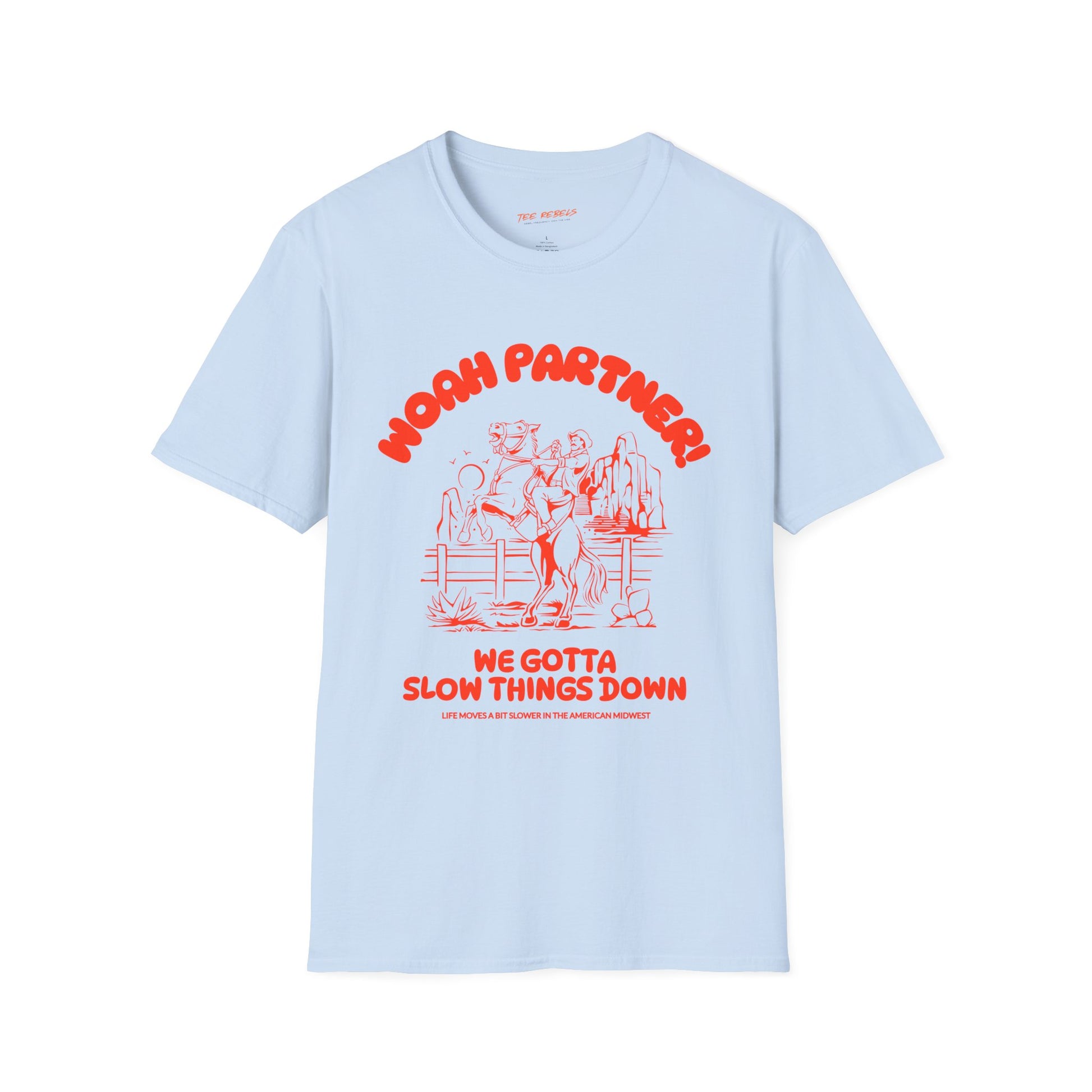 Woah Partner! We Gotta Slow Things Down Unisex Streetwear Graphic Tee - Fun and Comfortable Shirts for Everyday Wear, Perfect for Gifts, Festivals, Birthdays, Casual Outings, Spread Love